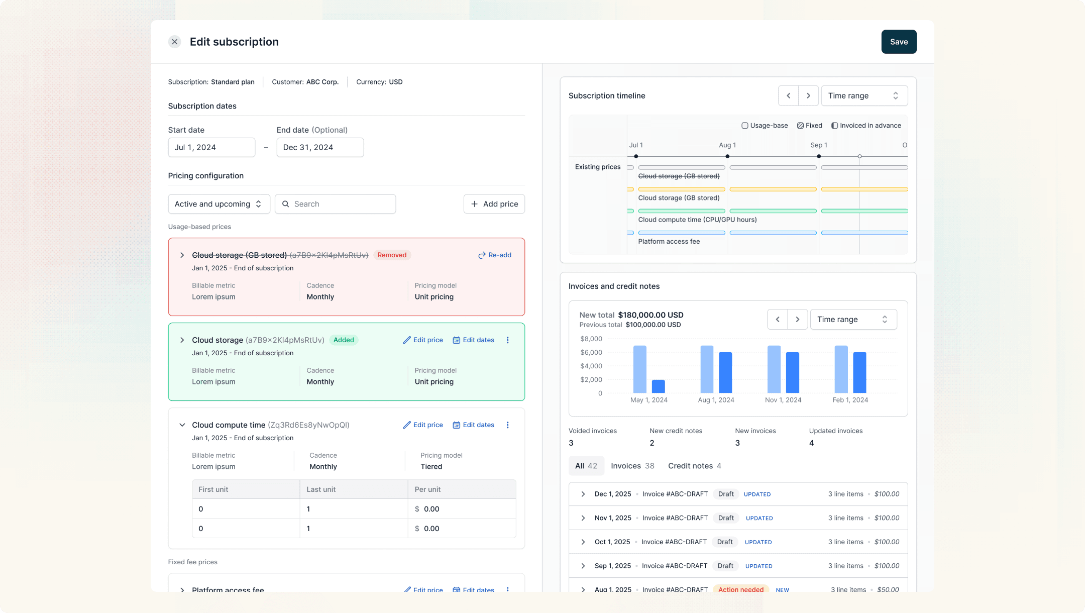 Orb didn't originally support editing subscriptions directly. When customers needed to make changes mid-term, whether adjusting prices, swapping products, or updating discounts, they had to work through convoluted alternatives like canceling and recreating subscriptions or complex workarounds that risked incorrect billings. Subscription editing was one of the most requested features from customers, but it had gone unbuilt for a long time because of how deeply it intersected with Orb's architecture. Any edit had to reconcile with price replacements, proration logic, and issued invoices without introducing inconsistencies. I led design, partnering closely with the CEO and Engineering to map out how edits should be supported, how to preview their billing and revenue impact before committing, and how to communicate the downstream effects of each change. I dove deep into the Orb architecture and billing engine with Engineering to understand all edge cases, landing on a flow that gave users confidence in what they were changing and what would happen as a result. Shipping subscription edit eliminated a long-standing source of customer friction, reduced the volume oof support and engineering escalations around subscription changes, and closed a major gap that had come up repeatedly in customer and sales conversations.